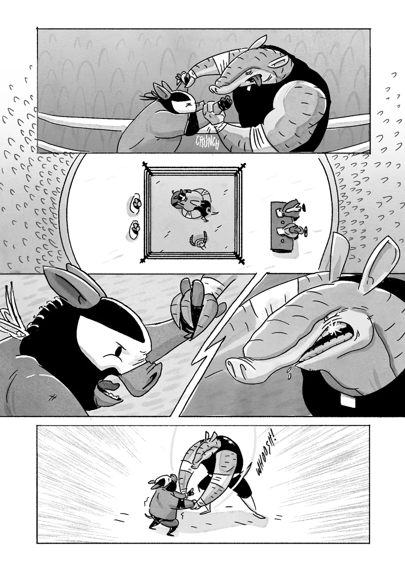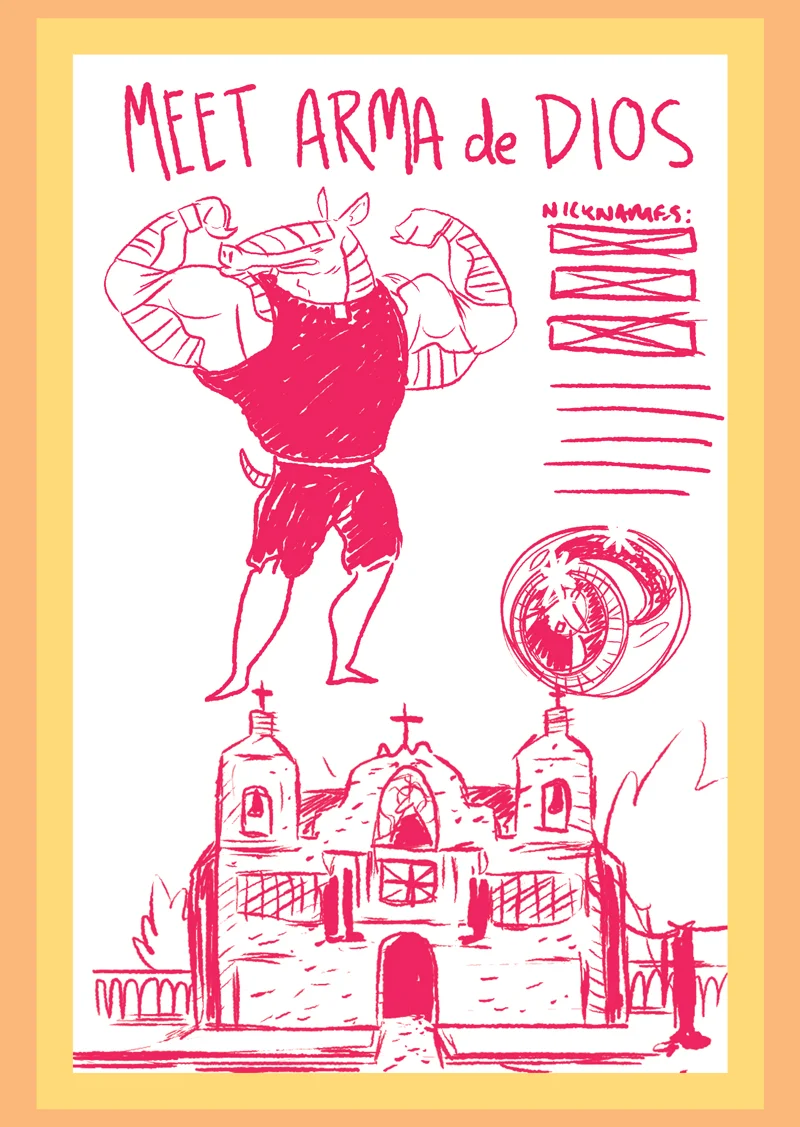 Arma de Dios (aka Dillo Daddy aka The Patron Saint of Pain aka God’s Weapon aka Father Flex) is the longstanding Ring Leader and priest of Mega Muscle Church. He’s a beefcake armadillo with no intention of letting Chorizo earn his first title win. Chorizo must defeat Arma and his lackeys, the Gibraltar Boys, in order to win his first championship ring. Arma is fueled by admiration and greed, previously using the persona Arma de Disco until the money and fanbase with that gimmick dried up.